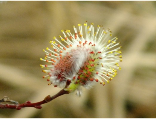 ネコヤナギ(猫柳) (Salix leucopithecia) 別名、フリソデヤナギ(振袖柳) ヤナギ科 ヤナギ属 花期、早春 樹高、2~3m 猫柳と山猫柳の雑種で、花は早春、葉の出る前に開花、花序は初め赤色で、光沢のある芽鱗に包まれている。