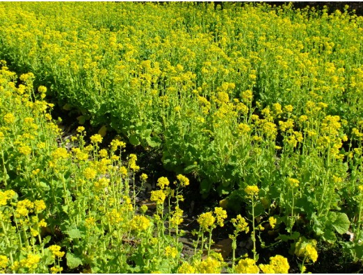 ナノハナ(菜の花)(Brassica campestris) 別名、ハナナ(花菜)、(ナタネ) アブラナ科 アブラナ属 花期、2~5月 草丈、50~150cm 明治初期にヨーロッパより渡来し油を取るために栽培。花序径、5~10cm。 ”菜の花や 月は東に 日は西に”