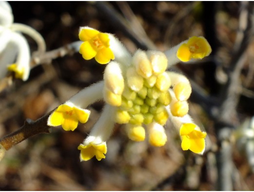 ミツマタ(三叉・三椏)(Edgeworthia chrysantha) 黄色 ジンチョウゲ科 ミツマタ属 花期、2~4月 樹高、100~200cm 中国、ヒマラヤ地方原産で、花は蜂の巣がぶら下がったような形で。 枝が3本ずつ分岐するので、これが名の由来です。