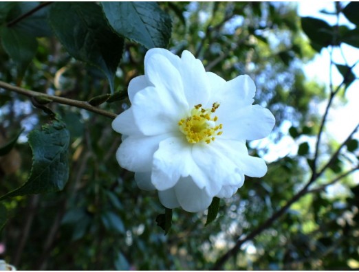 (椿)、キクカチャ(菊花茶)(Theaceae Camellia) ツバキ科 カメリア属 花期、1~3月 樹高、2~3m 中国原産、日本へは1980頃、花径3~4cm、白色の花を咲かせる、長弁短柱茶(十里香)の八重咲種。 2014年3月9日現在、キンカチャ(金花茶)は蕾硬しでした。