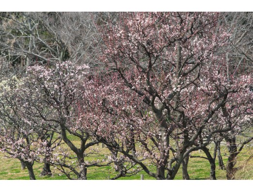 芝生広場から見た遅咲きの梅、 見ごろはもうすぐです。