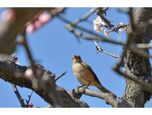 白梅の見事さに見惚れるいたとき、小鳥が飛来し枝に止まりました。姿形からモズだと思うのですが・・