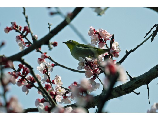 梅に良く似ていますがあんずの花です。蜜を求めてメジロが飛び交っていました。