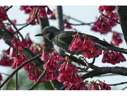 寒緋桜にヒヨドリが蜜を啄ばんでいました。
