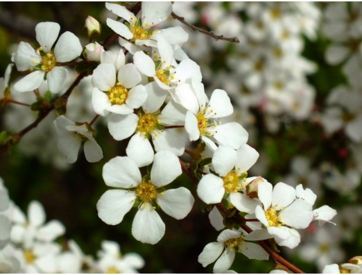 ユキヤナギ(雪柳)(Spiraea thunbergii) バラ科 シモツケ属 花期、3~4月 高さ、1~1.5m 前年枝に無柄の散形花序を多数つける。花は白色で直径約8mm。 花弁は5個。雄しべは20個。雌しべは5個。花柄は6~12mmで基部に数個の苞がある。