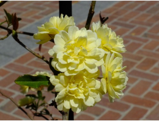 モッコウバラ(木香薔薇)(Rosa banksiae) バラ科 バラ属 花期、4~5月 樹高、6~7m蔓性 花径、2~3cm、八重の花が沢山房咲き、刺が無く白い花は香りが有るが黄色い花は香りは無い。 2014年4月15日 長居公園