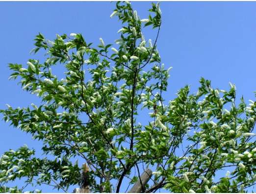 ウワミズザクラ(上溝桜)(Padus grayana) 別名、アンニンゴ(杏仁子) バラ科 ウワミズザクラ属 花期、4~5月 樹高、10~15m 花は、白い5弁の小花を長さ10cmの穂に多数総状につける。 新潟県を中心に花や実を食用にする。 2014年4月19日 長居公園