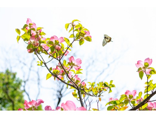 ハナミズキのまわりを蝶が飛び交い 光に透けた花びらがいっそう魅力的に見えます。