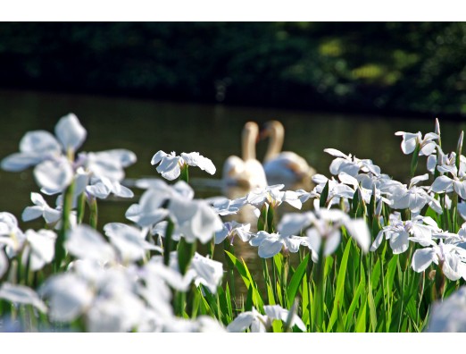 真っ白なあやめと 「なかよしこよし」の白鳥 ほのぼのとした時間が流れます。