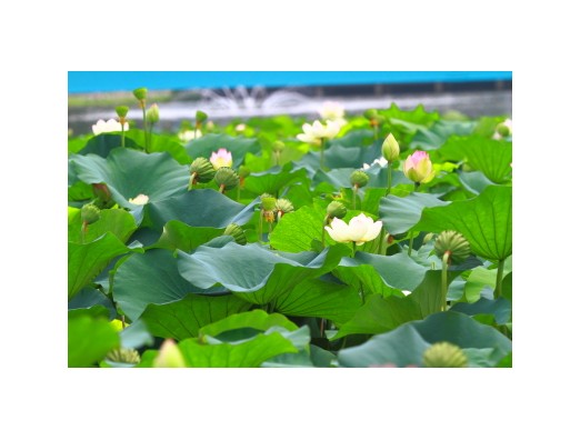 蓮池を風景風にして撮って見ました。 朝なのでハス花綺麗に咲いていました。。