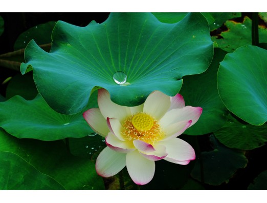 お日様のもと元気に咲いている蓮がたくさんある中、葉の下で、ひっそりと咲いている蓮が印象的でした