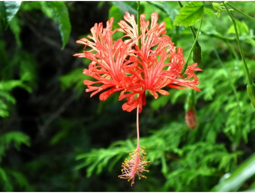 ハイビスカス・スキゾペタルス 別名、(風鈴仏桑華) アオイ科 フヨウ属 花期、6~11月 樹高、100~300cm 東ア原産のハイビスカスの仲間で、通常1日花ですが風鈴仏桑華は何日も咲く、花径、5~20cm、赤、桃色。 撮影日:2014年8月14日