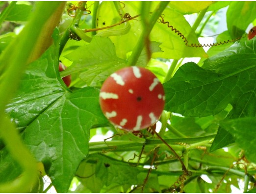 オキナワスズメウリ(沖縄雀瓜)(Diplocyclos palmatus (L.) C.Jeffrey) ウリ科 オキナワスズメウリ属 花期、周年 草丈、4~5mつる性 琉球列島から台湾、中国南部、インドに分布する一年生つる性植物。観賞用として日本の各地に栽培されています。実は10円玉ほど。
