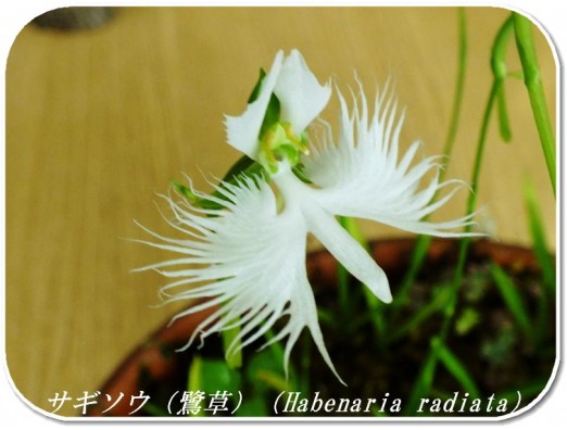 サギソウ(鷺草)(Habenaria radiata) ラン科 ミズトンボ属 花期、7~8月 草丈、20cm 本州から九州、台湾や朝鮮半島にも分布する多年草で、鉱物質土壌の湿原に生息する。花径3cm程の純白で白鷺に似た白い花を付ける。 2014年8月16日