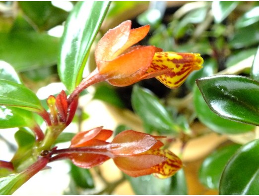ヒポシルサ・ネマタンサス(Hypocyrta nummularia) 別名、キンギヨノキ(金魚の木) イワタバコ科 ネマタンサス属 花期、5~10月 樹高、30~50cm 南米原産の熱帯性常緑低木、葉っぱに毛が無く、光沢が有り、金魚の様な花。 2014年8月16日