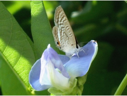 シカクマメ(四角豆)(Psophocarpus tetragonolobus (L.) D.C.) マメ科 シカクマメ属 花期、7~10月 草丈、2m以上 と、ツバメシジミ(燕小灰蝶)(Everes argiades) 2014年8且30日 長居公園