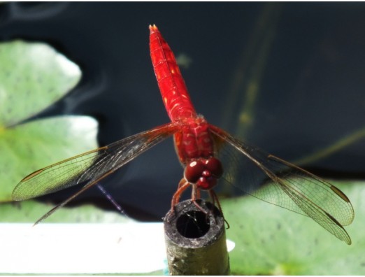 ショウジョウトンボ(猩猩蜻蛉)(Crocothemis serviana) アカトンボ亜科 大きさ、41~53mm 時期、5~10月 アカネよりも大きく赤い羽根の付け根が少しだけ黄色で、ネキトンボの方が羽根の付け根の黄色が大きい。 2014年8月30日 長居公園