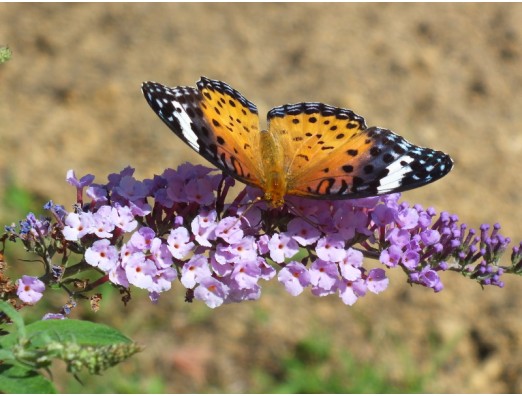 ツマグロヒョウモン(Argyreus hyperbius) 雌 タテハチョウ科 大きさ、27~38mm 時期、4~11月 分布、本州・四国・九州・沖縄 各種のスミレ類、パンジーなどの園芸種のスミレも食草とする。ヒョウモンチョウの中で一番よく見られる。 2014年9月13日