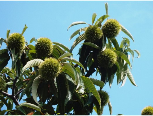 ツクバグリ(筑波栗)(Castanea crenata) 実 ブナ科 クリ属 花期、6~7月 樹高、約10m 落ちた実が石に似ている事から小石を意味する古語の「クリ」から。「桃 栗 3年柿8年」は実を結ぶまでの期間、フランス語では「マロン」。 撮影日:2014年9月13日