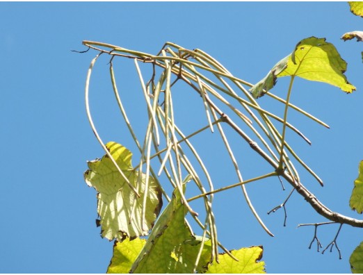 キササゲ(大木角豆)(Catalpa ovata G. Don)実 ノウゼンカズラ科 キササゲ属 花期、6~7月 樹高、5~15m 果実が豆のササゲに似てるので、キササゲの名、白に薄黄色の花を沢山つけます。果実は利尿剤、材は下駄などに利用。 2014年9月13日 長居公園