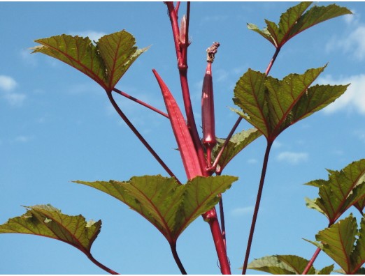 オクラ、ベニー(紅秋葵)(Abelmoschus esculentus Benny) アオイ科 トロロアオイ属 花期、7~10月 草丈、100~150cm アフリカ原産、名前のオクラは英語名から、黄色でトロロアオイと似た花です、オクラは8cm、トロロアオイは10~12cmと大きい。