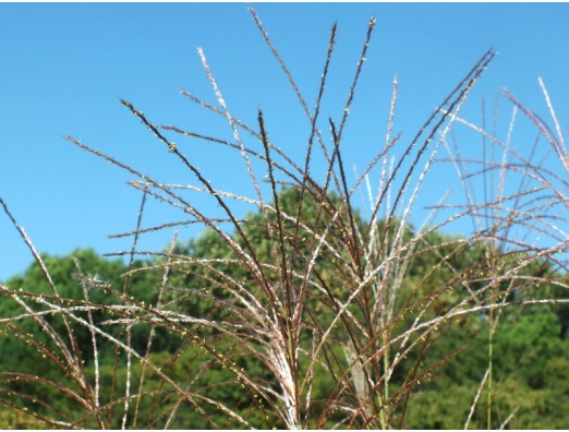 タカノハススキ(鷹の羽薄)(Miscanthus sinensis cv. Zebrinus) 別名、ゼブラグラス イネ科 ススキ属 花期、9月 草丈、100~150cm 園芸種で葉が斑入りを鷹の羽に見立てて鷹の羽薄の名が付いた。2014年9月27日 長居公園