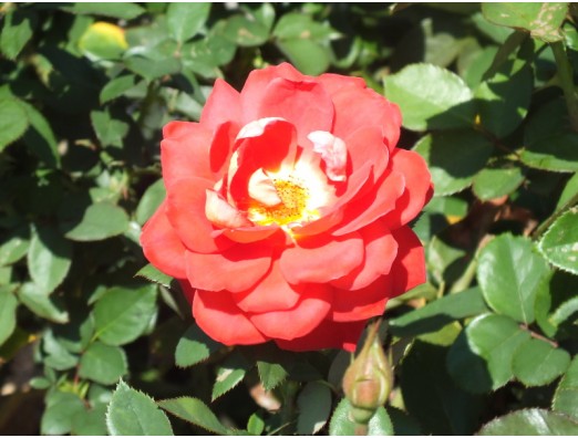 アヤオリ(あやおり)(Rosa Ayaori) 別名、舞(まい) 日本 1989年作出FL パラ科 バラ属 花期、四季咲き 樹高、70cm 花径、7cm花弁24枚で丸弁抱え咲き花色、緋紅色地で黄色み帯びている、中輪 。 2014年10月18日 長居公園