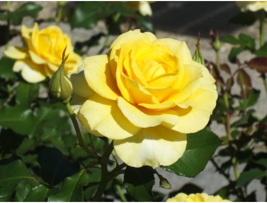 ゴールド・バニー(Rosa Gold Bunny) フランス 1978年作出 バラ科 バラ属 花期、四季咲き 樹高、2~3m 花径、11cm 花弁、25枚半剣咲き、花色、濃黄色。中輪、微香。 2014年10月19日 長居公園