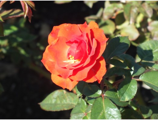 コンチェルティーノ(Rosa Concertino) フランス 1976年作出 バラ科 バラ属 花期、四季咲き 樹高、90cm 花径、6cm 花弁、約20枚丸弁平咲きで、花色は赤。中輪、微香。2014年10月19日 長居公園