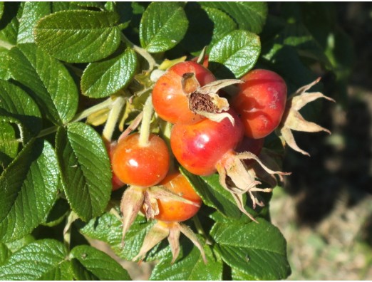 ハマナス(浜茄子、浜梨)(Rosa Rugosa)実 別名、ロサ・ルゴサ(浜梨の原種) バラ科 バラ属 花期、5~7月 樹高、80~150cm 花径、6~8cm花色は桃、白色、海岸近くに有り、葉や枝に細かい刺がありピンク色で香りの良い花が咲く。