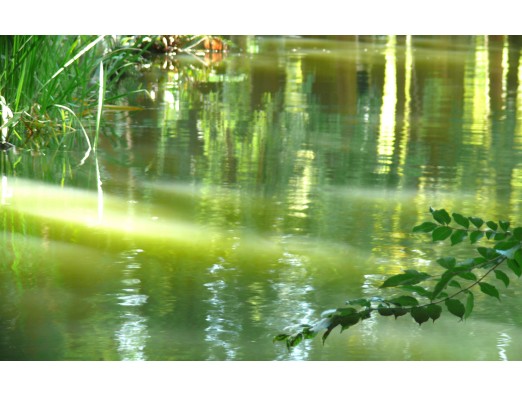 太陽の光が樹木や水草の間から湖面に照らしています。この配色、落ち着きます。
