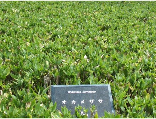 オカメザサ(阿亀笹)(Shibataea kumasaca) 別名、ブンゴザサ、ゴマイザサ イネ科 オカメザサ属 草丈、1~2m 直径、1~5mm 岩手県から九州に分布日本原産のタケ類の一つですが野生の発見は難しく殆どが園芸種。 2014年10月25日 長居公園