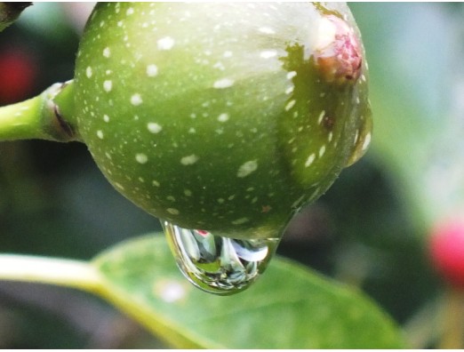 イヌビワ(犬枇杷) (Ficus erecta) 実と雫 別名、イタビ クワ科 イチジク属 花期、4~5月 樹高、5m 関西以西から沖縄の海岸や沿海の山地に自生。雌雄異株で果実のように見える中で花が咲いている。2014年11月2日 長居公園