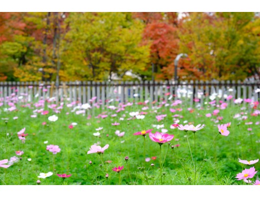 鮮やかに染まった長居公園の外周道路の木々をバックに コスモスも得意げに咲いています。