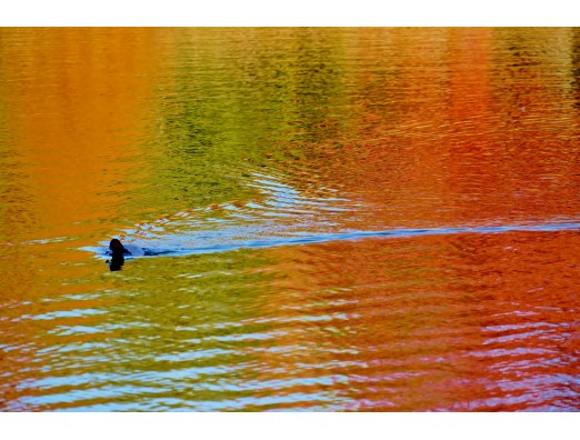 大池の水面には楓の紅葉投影 キンクロハジロが遊泳してます