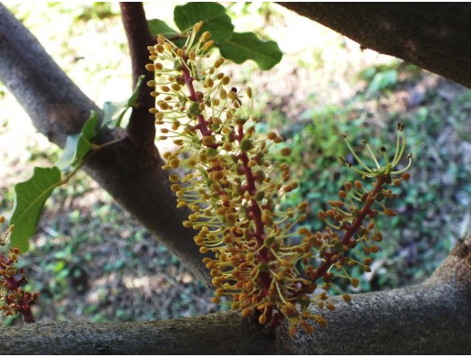 イナゴマメ(蝗豆)(Ceratonia siliqua L.) マメ科 ケラトニア属 花期、9~11月 樹高、10m以上 地中海地方原産の常緑高木、豆の莢や、花は赤く花弁が無は。種子は食用、飼料になる。 2014年11月 長居公園